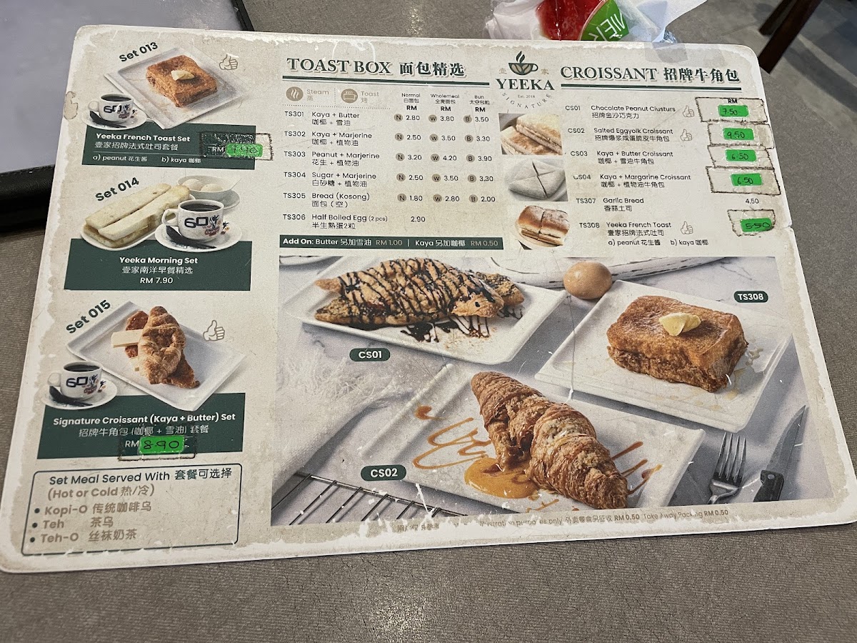 Yeeka Crispy Croissants: This category features several croissant variations including salted egg yolk, tuna cheese, sugar margarine, and chocolate peanut. These items combine local flavors with classic pastry styles.