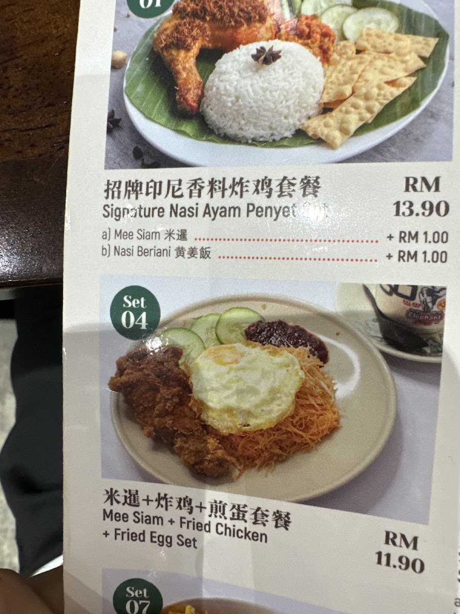 Nasi Briyani Series: This group includes several rice-based dishes paired with different proteins such as Ayam Merah, Fried Egg, Ayam Penyet, Ayam Goreng, and Ayam Rendang. These meals provide hearty main course options with prices ranging from MYR 9.90 to MYR 17.90.